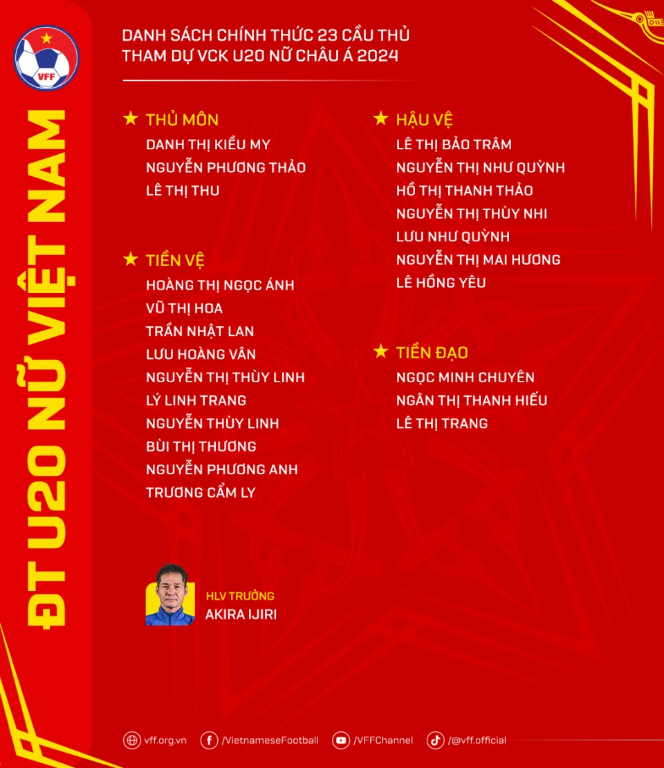 Chiều 3/3, Huấn luyện viên trưởng Akira Ijiri đã chính thức chốt danh sách 23 cầu thủ Đội tuyển U20 Nữ Việt Nam tham dự Vòng Chung kết U20 nữ châu Á 2024 tại Tashkent, Uzbekistan.