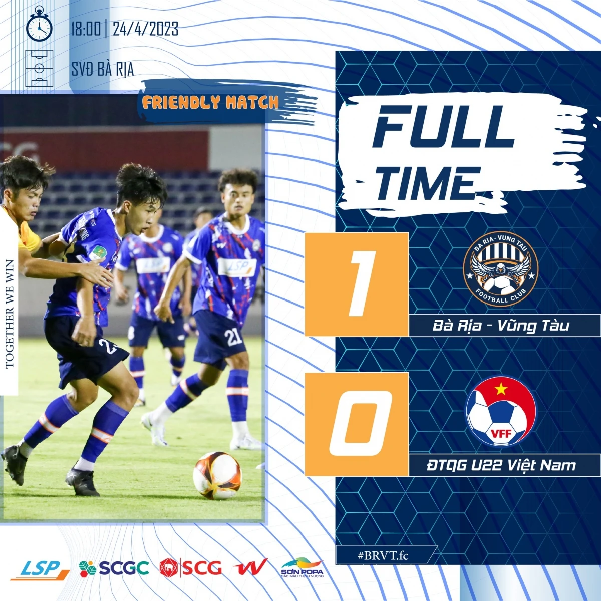 U22 Việt Nam thất bại 0-1 trong trận giao hữu với CLB Bà Rịa – Vũng Tàu, diễn ra chiều tối ngày 24/4. Bàn thắng duy nhất của trận đấu được ghi bởi tiền đạo Khánh Duy, sau nỗ lực đột phá của Trung Hiếu trong hiệp 1.