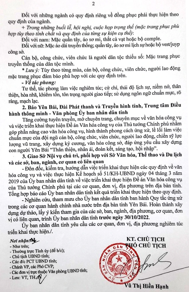 Phó Chủ tịch UBND tỉnh Yên Bái- Vũ Thị Hiền Hạnh vừa ký Công văn số 3404/UBND-TH yêu cầu các sở, ban, ngành, đoàn thể của tỉnh thực hiện trang phục, tác phong nơi làm việc của cán bộ công chức, viên chức, người lao động trong các cơ quan hành chính nhà nước trên địa bàn tỉnh; trong đó nhấn mạnh trong thời gian thực thi nhiệm vụ, cán bộ, công chức, viên chức, người lao động phải mặc trang phục phù hợp với tính chất công việc, đặc thù của từng ngành và thuần phong, mỹ tục của dân tộc.
