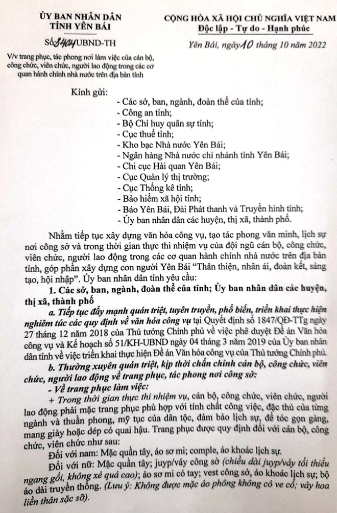 UBND tỉnh Yên Bái yêu cầu cán bộ, công chức, người lao động cơ quan hành chính mặc trang phục phù hợp, lịch sự, gọn gàng; giữ thuần phong, mỹ tục