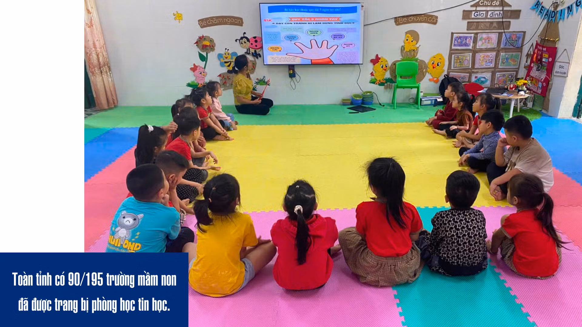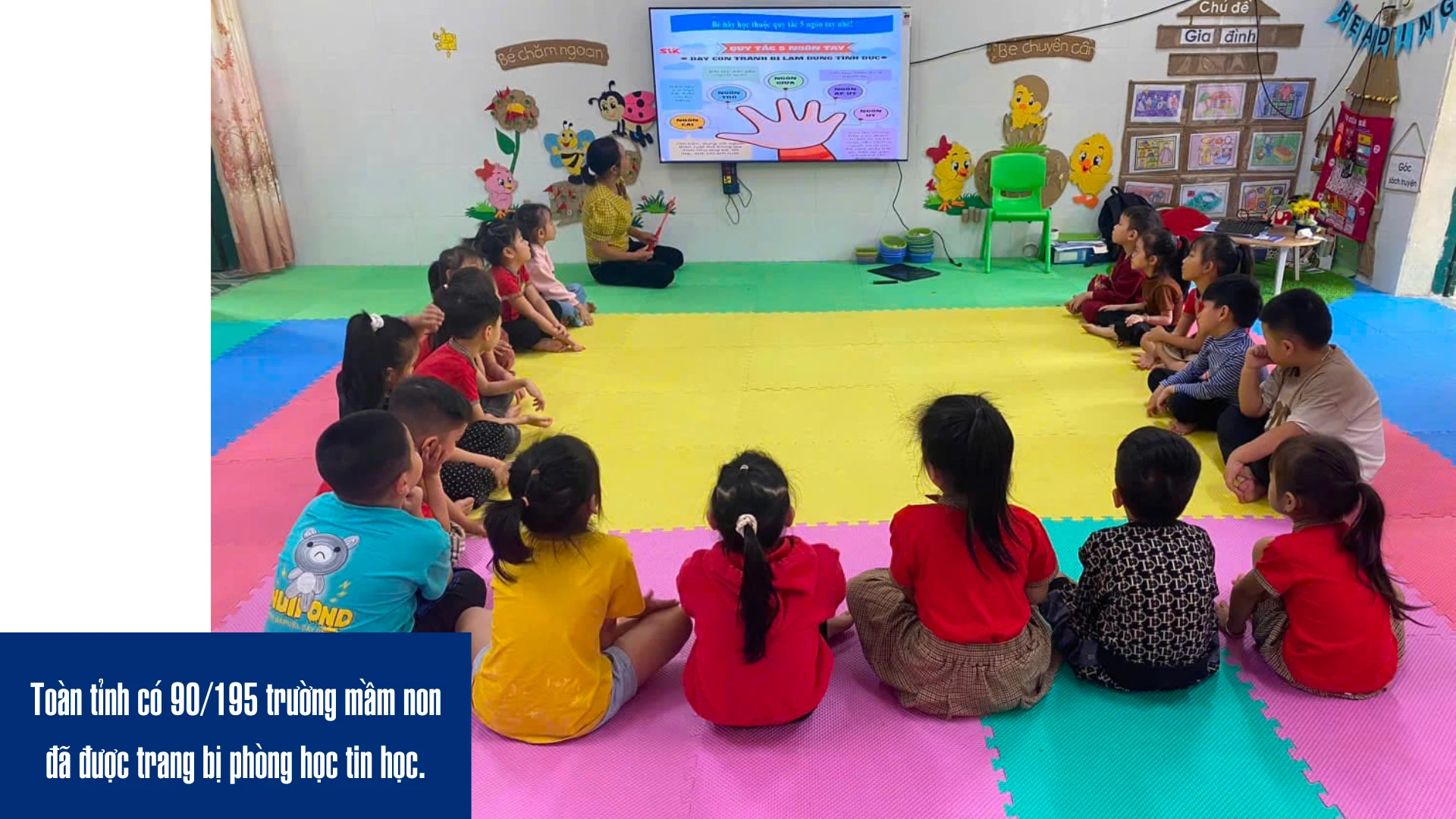 Tính đến tháng 3/2025, toàn tỉnh có 90/195 trường mầm non đã được trang bị phòng học tin học. Hệ thống cơ sở vật chất phục vụ giảng dạy CNTT cũng ngày càng được hoàn thiện với 90 phòng thực hành tin học (mỗi phòng có 5 - 10 máy tính), 465 máy tính phục vụ công tác quản lý giáo dục, 566 máy in, 1.294 máy chiếu và màn hình ti vi, cùng 11 bảng tương tác thông minh. So với năm học trước, số trường có phòng học tin học tăng thêm 5, tăng 9 phòng thực hành và 7 bảng tương tác. Những con số này phản ánh sự quan tâm và đầu tư mạnh mẽ của tỉnh Lào Cai đối với ứng dụng CNTT trong giáo dục mầm non.