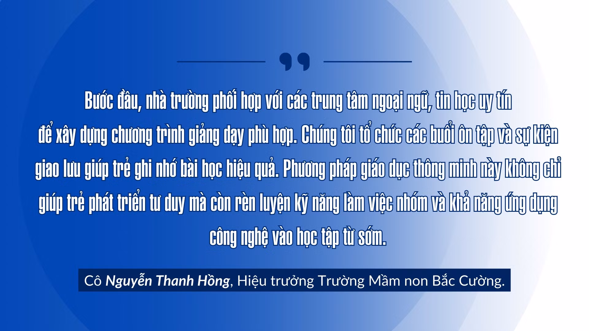 Trường Mầm non Bắc Cường (thành phố Lào Cai) là một trong những đơn vị tiên phong trong việc đầu tư và ứng dụng công nghệ thông tin (CNTT) vào giảng dạy. Từ năm học 2022 - 2023, nhà trường đã xây dựng phòng học thông minh và nâng cấp hệ thống máy tính được cài đặt phần mềm Kidsmart phục vụ dạy học. Việc áp dụng các phương pháp như lớp học kết nối, lớp học đảo ngược đã giúp trẻ có cơ hội tiếp cận môi trường giáo dục hiện đại, sáng tạo.