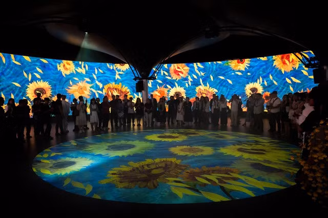 Khán giả trải nghiệm không gian Van Gogh Immersive 720 với các hiệu ứng ánh sáng đẹp mắt.