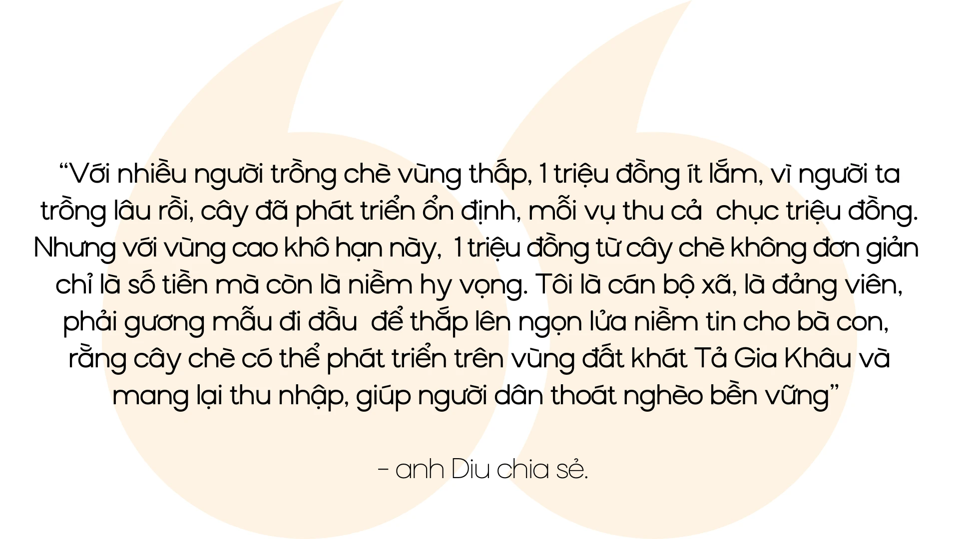 Những vạt chè non, những đồi cây còn nhỏ chưa thể cho thu hoạch nhưng lại chứa đựng hy vọng lớn lao. Bà con không còn nhìn chè như một cây trồng xa lạ, mà coi đó là cơ hội để thoát khỏi đói nghèo, bảo vệ đất, bảo vệ môi trường và xây dựng tương lai cho con em mình.