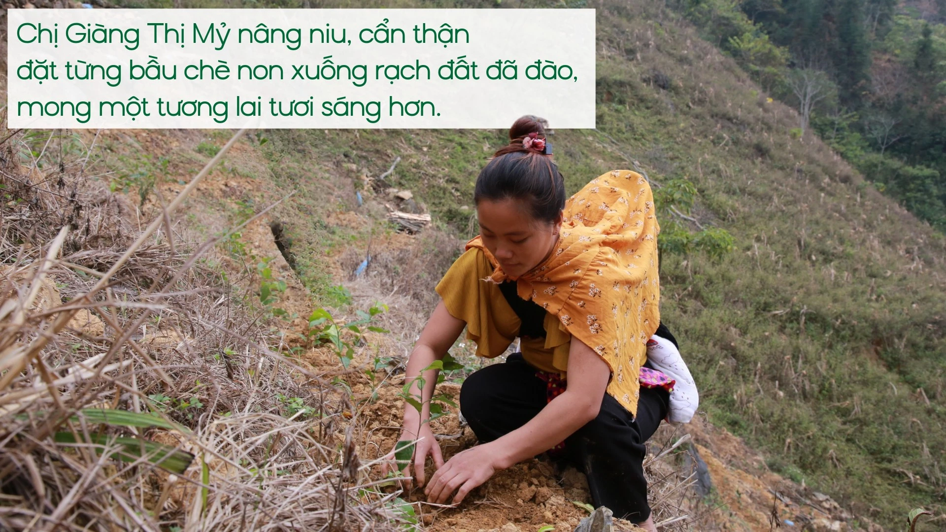 Ắt hẳn, trong tâm trí của những nông dân ấy đã có một “cuộc chiến” về sự chọn lựa, giữa việc kiên nhẫn với từng vụ ngô để có thêm lương thực hay đặt niềm tin vào một cây trồng mới. Những người trẻ như chị Mỷ can đảm hơn nên mạnh dạn đăng ký chuyển đổi. Được hỗ trợ cây giống, vợ chồng chị Mỷ cùng nhau lên nương đào rạch, cẩn thận trồng từng gốc chè như ươm mầm cho chính hy vọng đổi thay của cuộc đời mình.