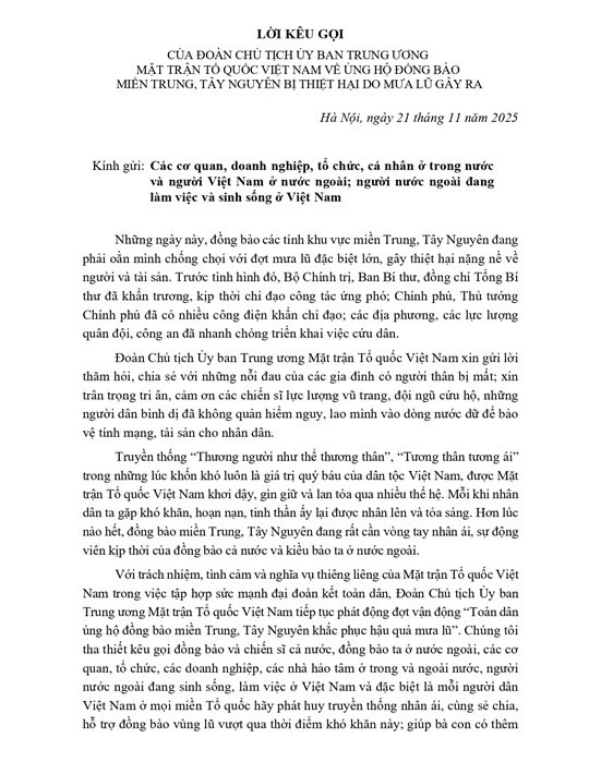 Những ngày này, đồng bào các tỉnh khu vực miền Trung, Tây Nguyên đang phải chống chọi với đợt mưa lũ đặc biệt lớn, gây thiệt hại nặng nề về người và tài sản. Hậu quả sau bão và mưa lũ là vô cùng nghiêm trọng, làm nhiều người chết, mất tích và bị thương; nhà cửa, tài sản của Nhân dân bị thiệt hại nặng nề; cơ sở vật chất, hạ tầng bị hư hại; ước tính sơ bộ thiệt hại lên đến hàng chục nghìn tỷ đồng.