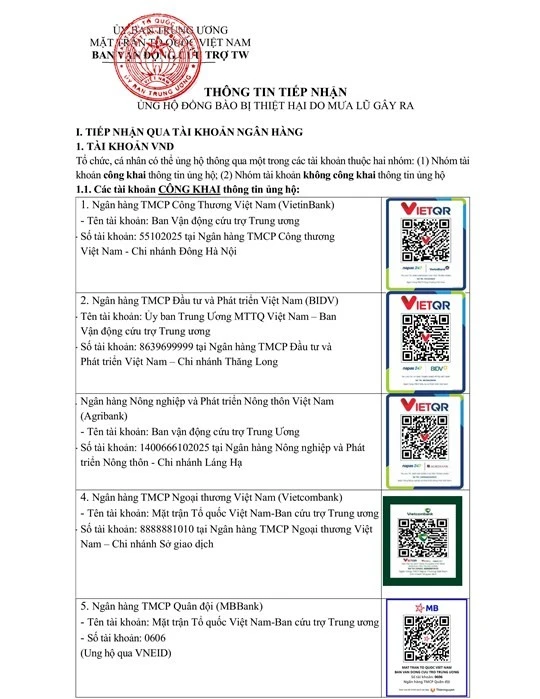 - Tên tài khoản: Mặt trận Tổ quốc Việt Nam - Ban cứu trợ Trung ương