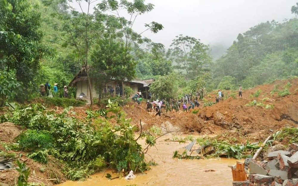 Các lực lượng tham gia giúp người dân tìm kiếm người chết do sạt lở đất.