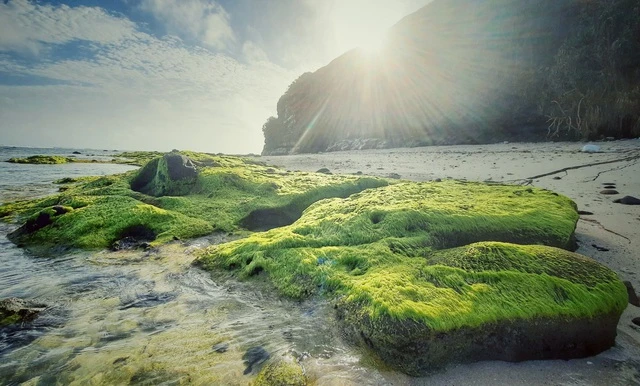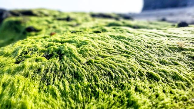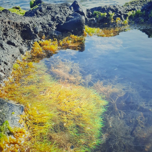 Mùa này, những bãi đá trầm tích ở Lý Sơn khoác lên mình màu áo mới. Màu đen bóng của đá nham thạch triệu năm tuổi được thay bằng màu xanh mướt của rong rêu mọc lên từ biển cả.