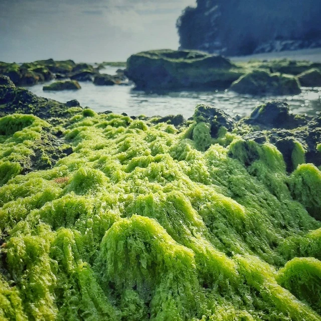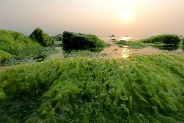 Đầu xuân, thời tiết dần ấm áp cũng là lúc những "cánh đồng" rong, rêu mọc lên dày đặc trên những bãi đá nham thạch triệu năm tuổi. Màu xanh của rong, rêu khiến những bãi đá trầm tích ở Lý Sơn trở nên xanh mướt. Hiện đang là thời điểm thích hợp nhất để du khách có thể chiêm ngưỡng khung cảnh tuyệt đẹp này.
