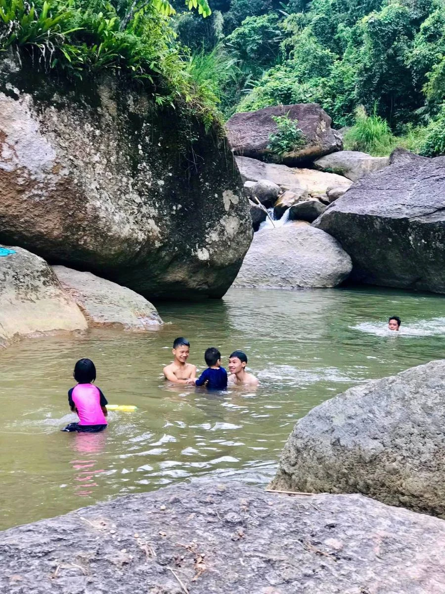 Nước chảy từ trên thác xuống tạo thành vũng sâu dưới chân núi, du khách có thể tắm mát.