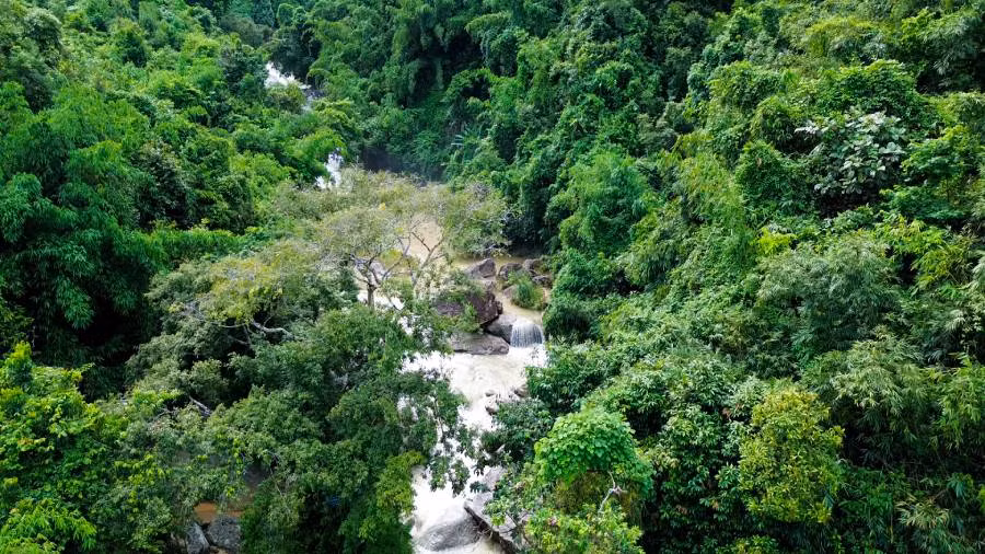 Bên thác, cây đa cổ thụ vắt ngang dòng nước, bên trên có những cụm phong lan rừng thi nhau trổ hoa buông lơ lửng xuống dòng thác. Những vạt hoa rừng như hoa ban, hoa chôm chôm rừng, hoa chuối rừng thi nhau khoe sắc bốn mùa. Những đàn cá suối đuôi hồng thỏa sức bơi lượn trong những xoáy nước nhỏ trông thật gần gũi, những chú chim thi nhau hót vang tạo thành một “hòa âm” của núi, của thác, của mây trời. Đặt chân tới đây, du khách như quên đi những bộn bề của cuộc sống thường ngày để hòa mình vào thiên nhiên, đắm mình trong bức tranh sơn thủy tuyệt diệu.