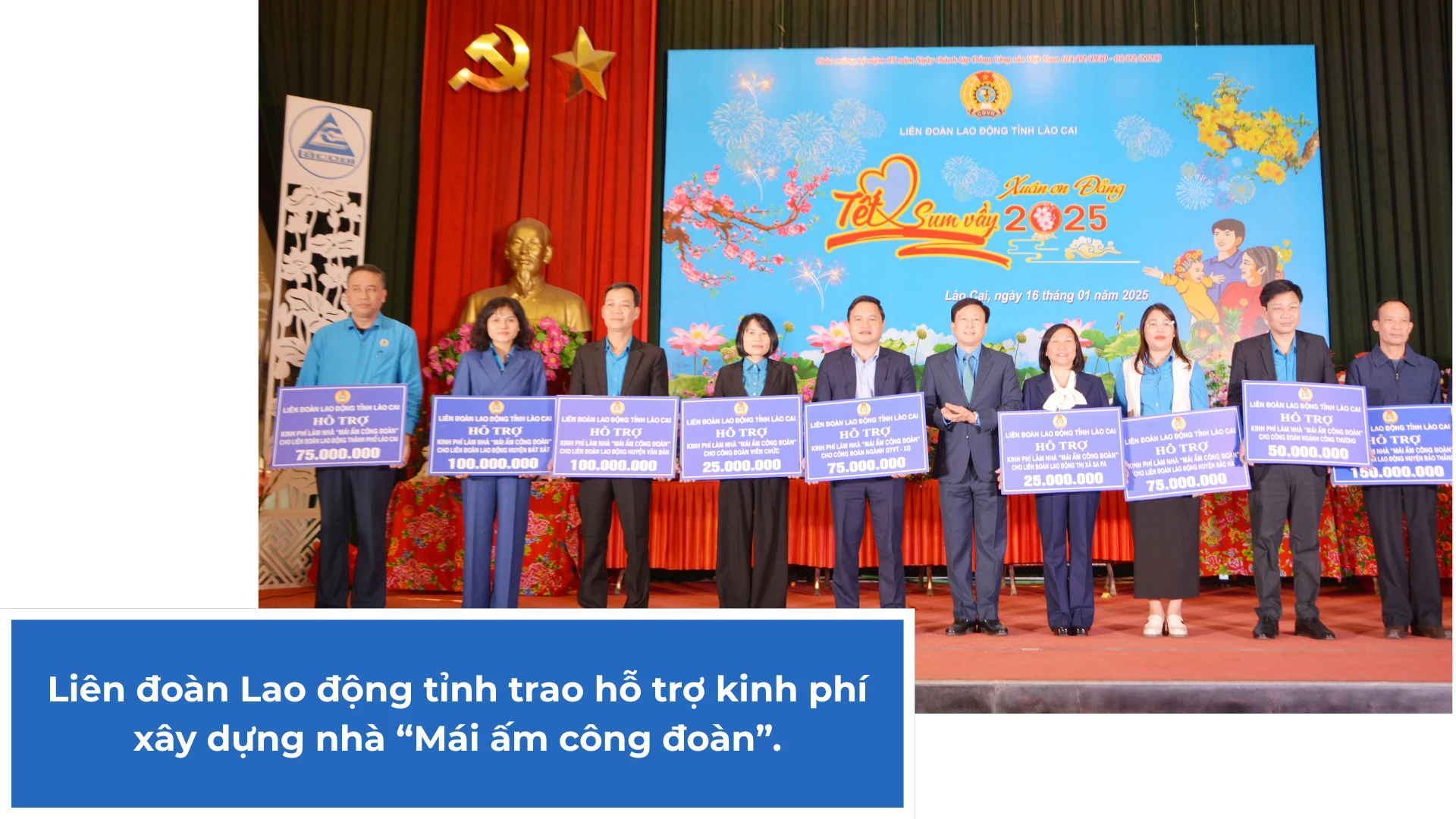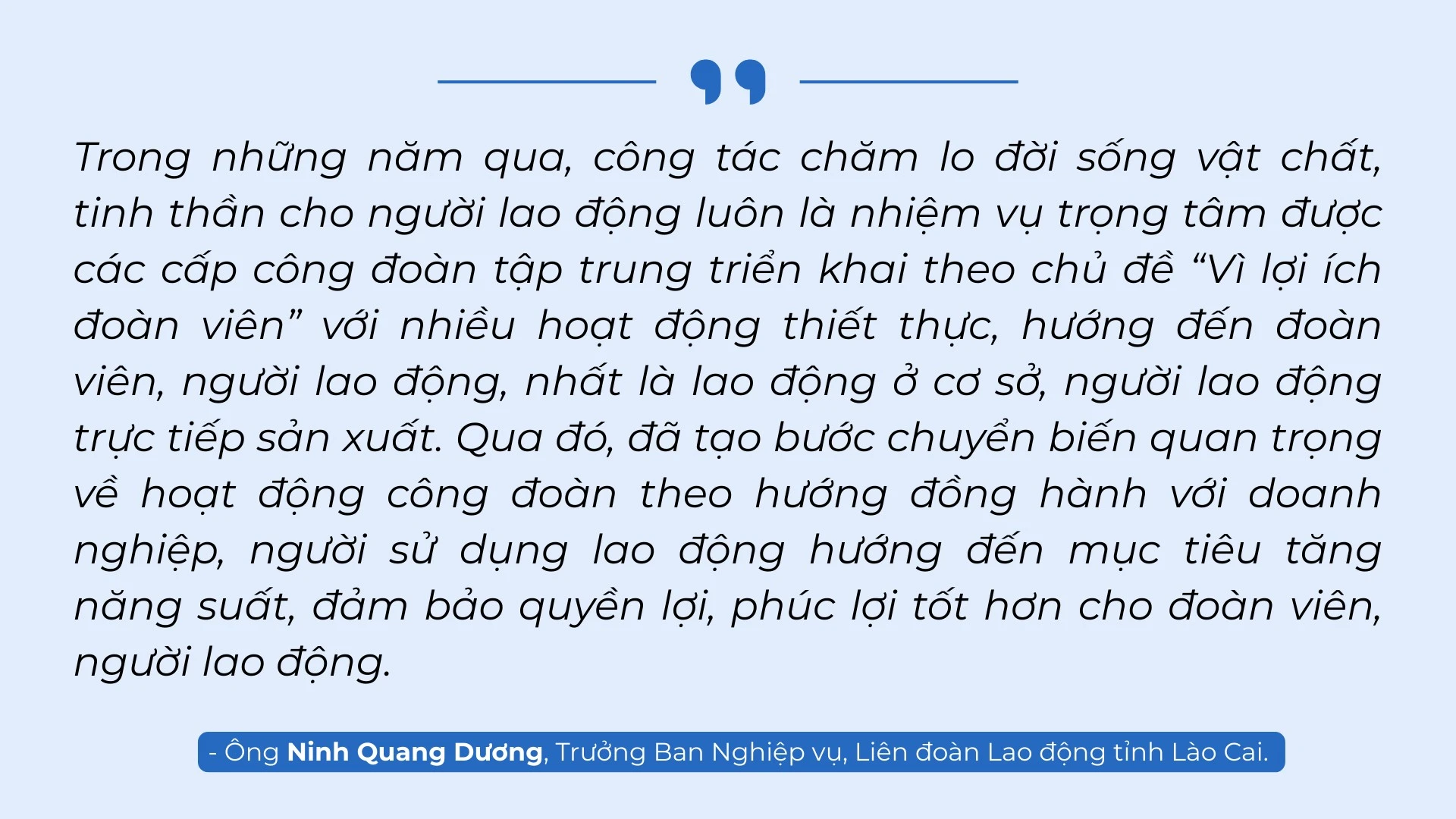 Nổi bật trong tổ chức các hoạt động chăm lo cho người lao động là từ năm 2024 đến nay, các cấp công đoàn trong tỉnh đã tổ chức thành công chuỗi hoạt động “Bữa cơm công đoàn”. Trong đó, đã có 75 công đoàn cơ sở phối hợp với thủ trưởng cơ quan, đơn vị, chủ doanh nghiệp tổ chức chương trình với 7.779 đoàn viên công đoàn tham gia. Ngoài ra, tiếp tục thực hiện chương trình “Phúc lợi cho đoàn viên công đoàn”, các cấp công đoàn trong tỉnh đã duy trì thực hiện tốt nội dung đã ký với các doanh nghiệp. Trong đó, có gần 6.500 đoàn viên được hưởng lợi với các chính sách ưu đãi khi sử dụng dịch vụ, sản phẩm do các doanh nghiệp cung cấp; trên 4.000 đoàn viên được khám bệnh, tầm soát ung thư miễn phí. Đặc biệt, hoàn lưu bão số 3 năm 2024 đã khiến 2.140 hộ đoàn viên, người lao động của tỉnh bị thiệt hại nặng về nhà ở và tài sản; Liên đoàn Lao động tỉnh đã kết nối, huy động các nguồn lực để chi hỗ trợ hơn 6,8 tỷ đồng cho 100% gia đình đoàn viên bị thiệt hại do thiên tai...