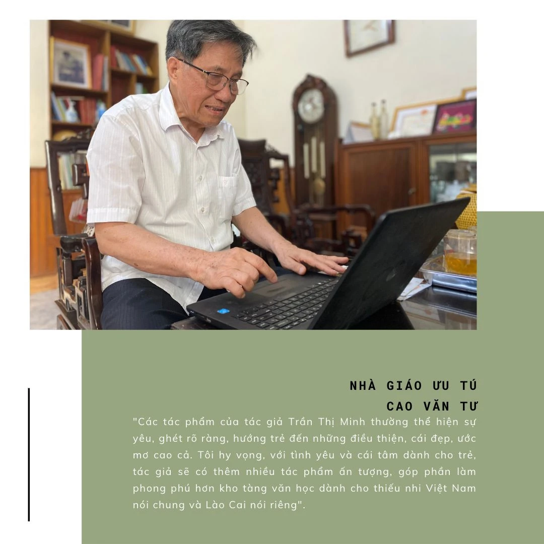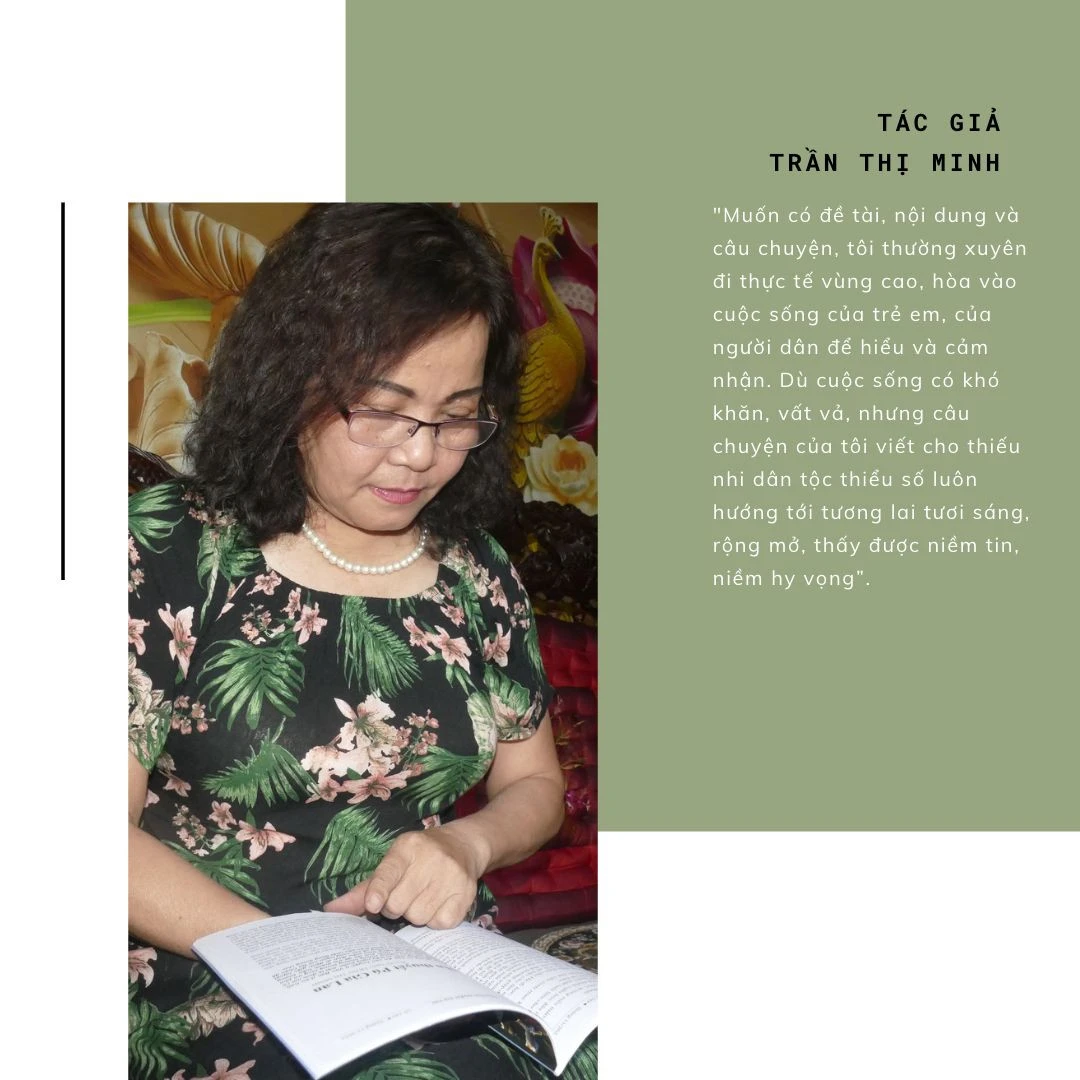 “Lào Cai là tỉnh miền núi có nhiều đồng bào dân tộc thiểu số sinh sống, mà trẻ em người dân tộc thiểu số ở vùng cao thường chịu nhiều thiệt thòi nên tôi muốn dùng ngòi bút của mình viết thật nhiều câu chuyện cho thiếu nhi vùng cao. Tôi muốn mình mang tâm hồn trẻ thơ khi viết cho lứa tuổi này. Muốn có đề tài, nội dung và câu chuyện, tôi thường xuyên đi thực tế vùng cao, hòa vào cuộc sống của trẻ em, của người dân để hiểu và cảm nhận. Dù cuộc sống có khó khăn, vất vả, nhưng câu chuyện của tôi viết cho thiếu nhi dân tộc thiểu số luôn hướng tới tương lai tươi sáng, rộng mở, thấy được niềm tin, niềm hy vọng”, tác giả Trần Thị Minh trải lòng.