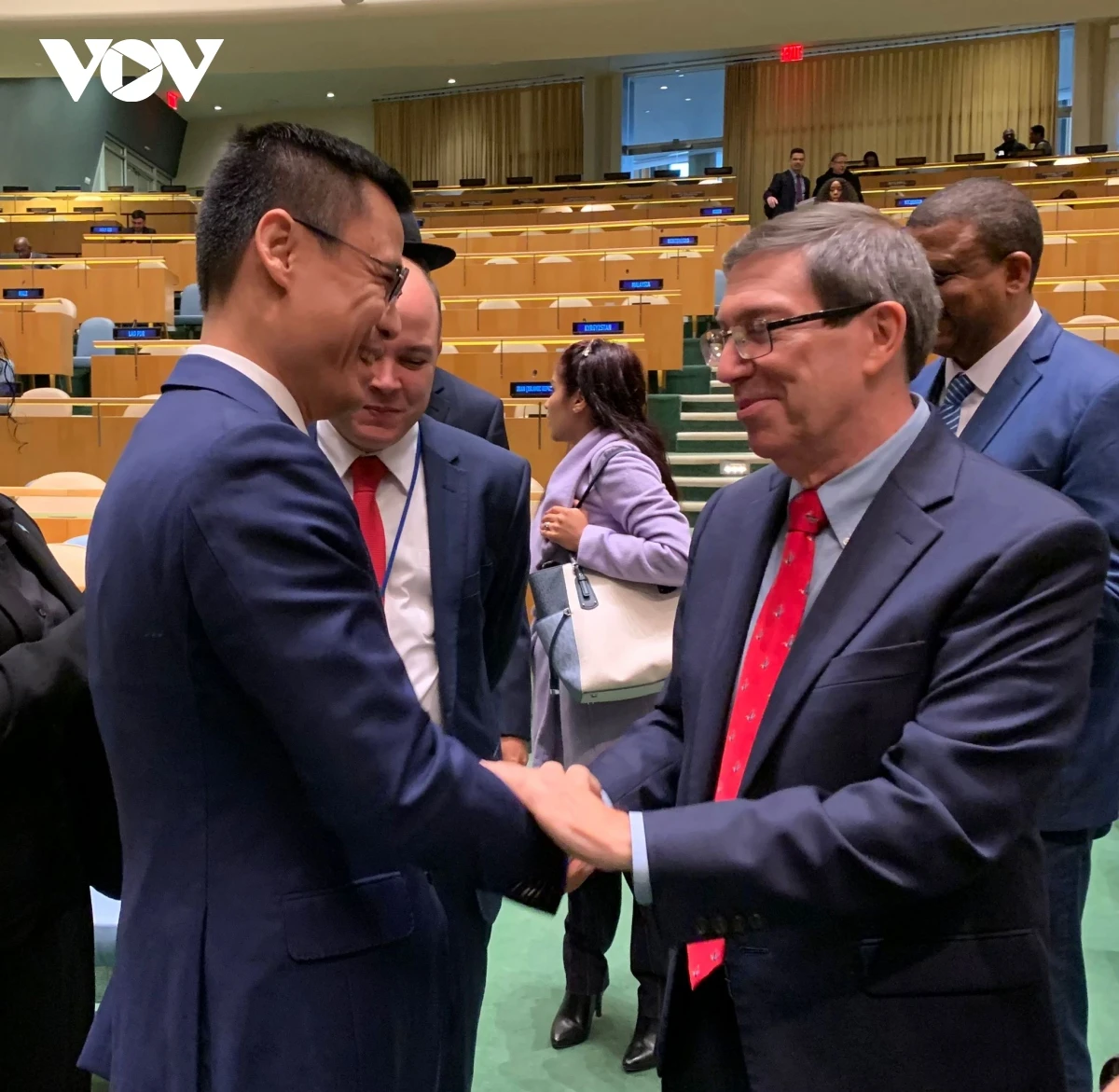 Đại sứ Đặng Hoàng Giang, Trưởng Phái đoàn Việt Nam tại Liên hợp quốc cùng Bộ trưởng Ngoại giao Cuba Bruno Rodriguez.