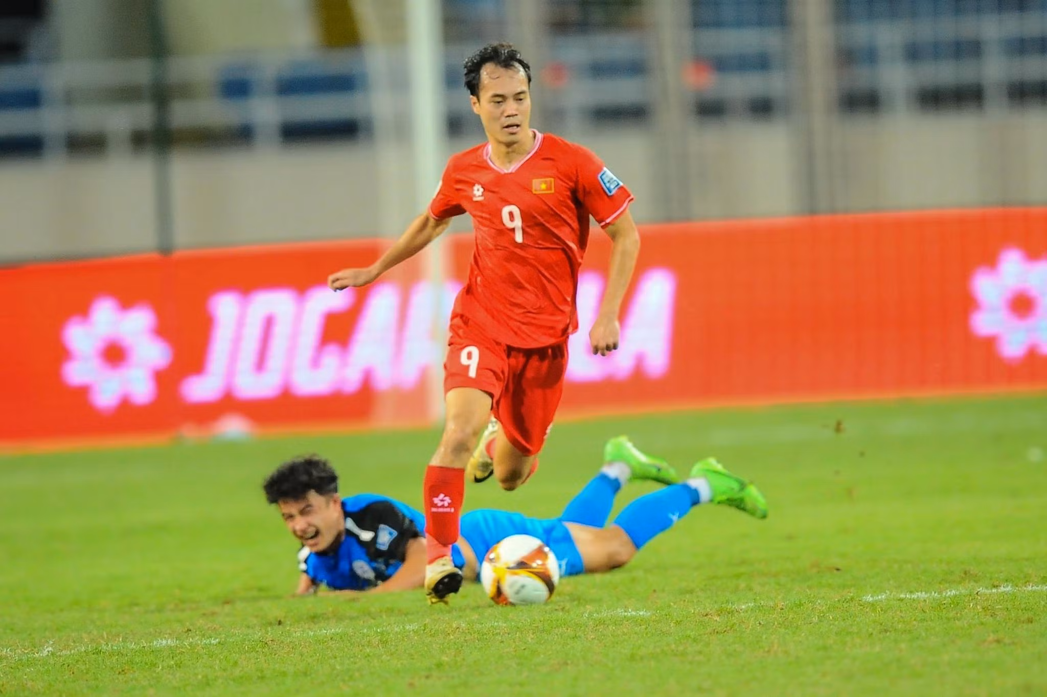 Phút 41, hàng thủ Việt Nam lại để lộ khoảng trống. Từ pha căng ngang của đồng đội, Patrick Reichelt nhoài người dứt điểm đưa bóng đi chệch khung thành của Văn Lâm trong gang tấc. Khuất Văn Khang đang thi đấu không tốt trong vai trò của một cầu thủ chạy cánh trái.