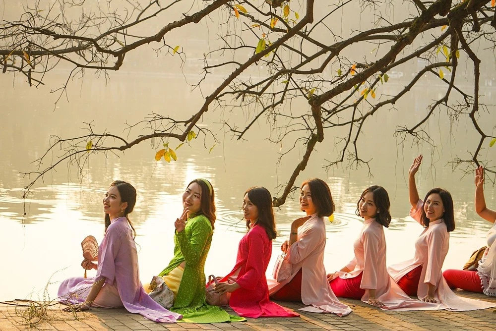 Các thiếu nữ Hà Nội dịu dàng trong trang phục áo dài bên Hồ Hoàn Kiếm.