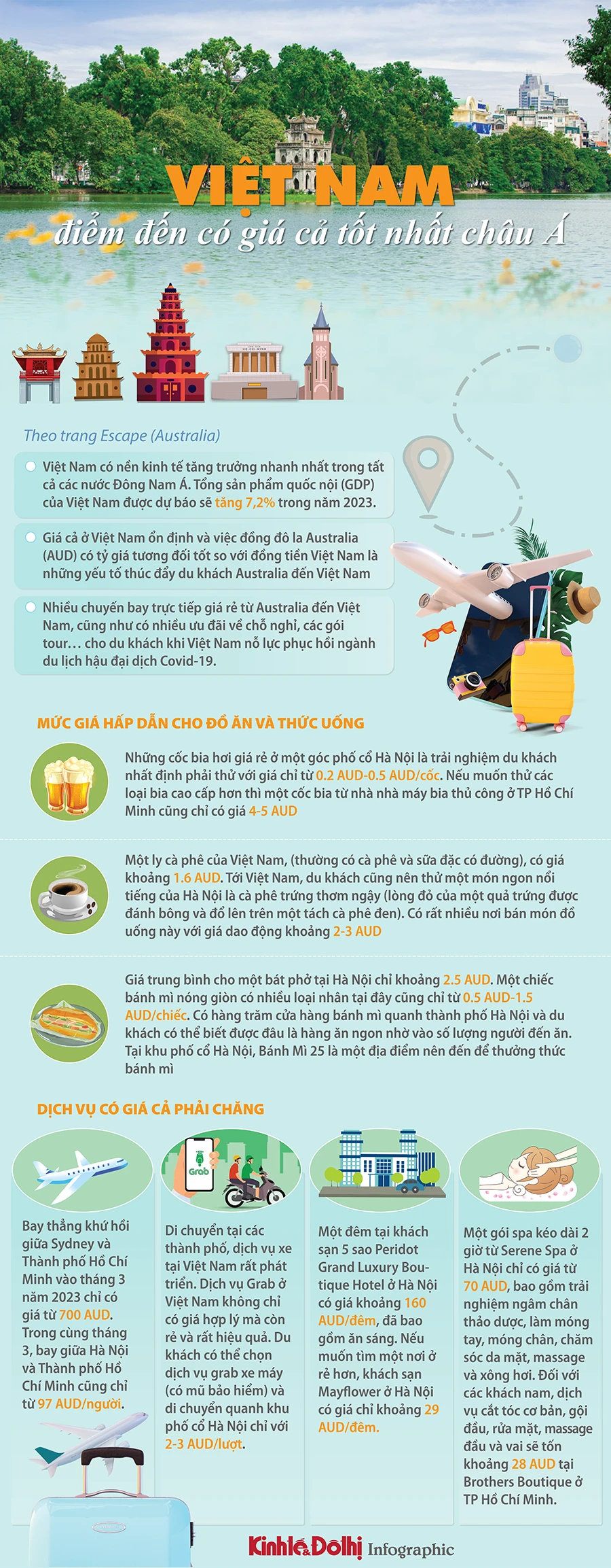 Theo trang Escape (Australia), khi tính đến chi phí du lịch, Việt Nam đang mang lại giá trị tốt nhất châu Á. Đồng đô la Australia đang có tỷ giá tốt với đồng tiền Việt Nam và giúp du khách Australia tiết kiệm được đáng kể.