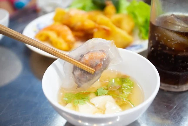 Hoành thánh được luộc và những miếng ngon nhất thì trơn đến mức gần như không thể gắp được bằng đũa.