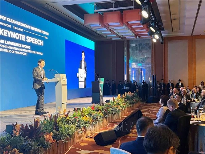 Thủ tướng Singapore Lawrence Wong phát biểu khai mạc Diễn đàn Nhà đầu tư Kinh tế Sạch tại Singapore.
