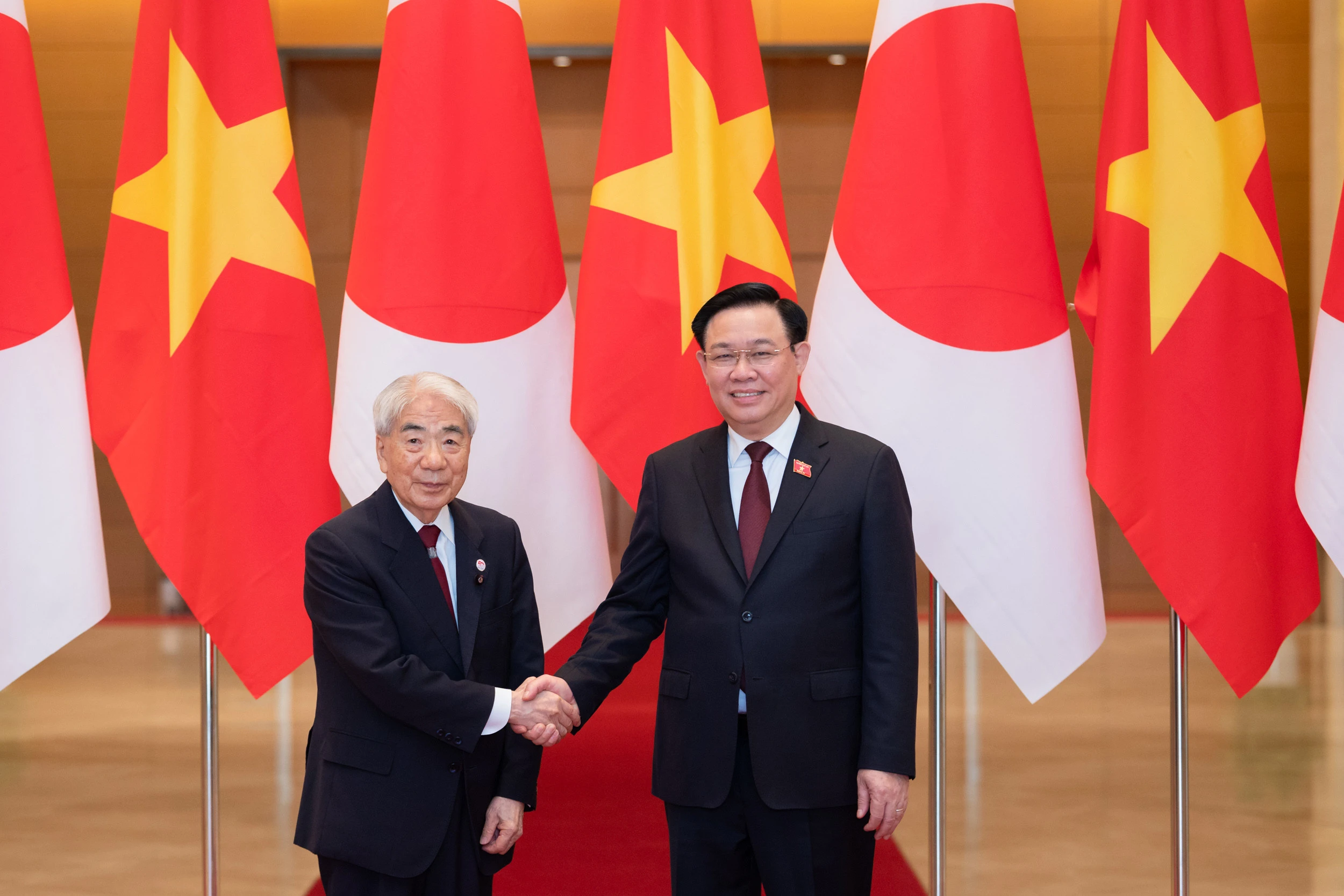 Chủ tịch Quốc hội Vương Đình Huệ đón Chủ tịch Thượng viện Nhật Bản.
