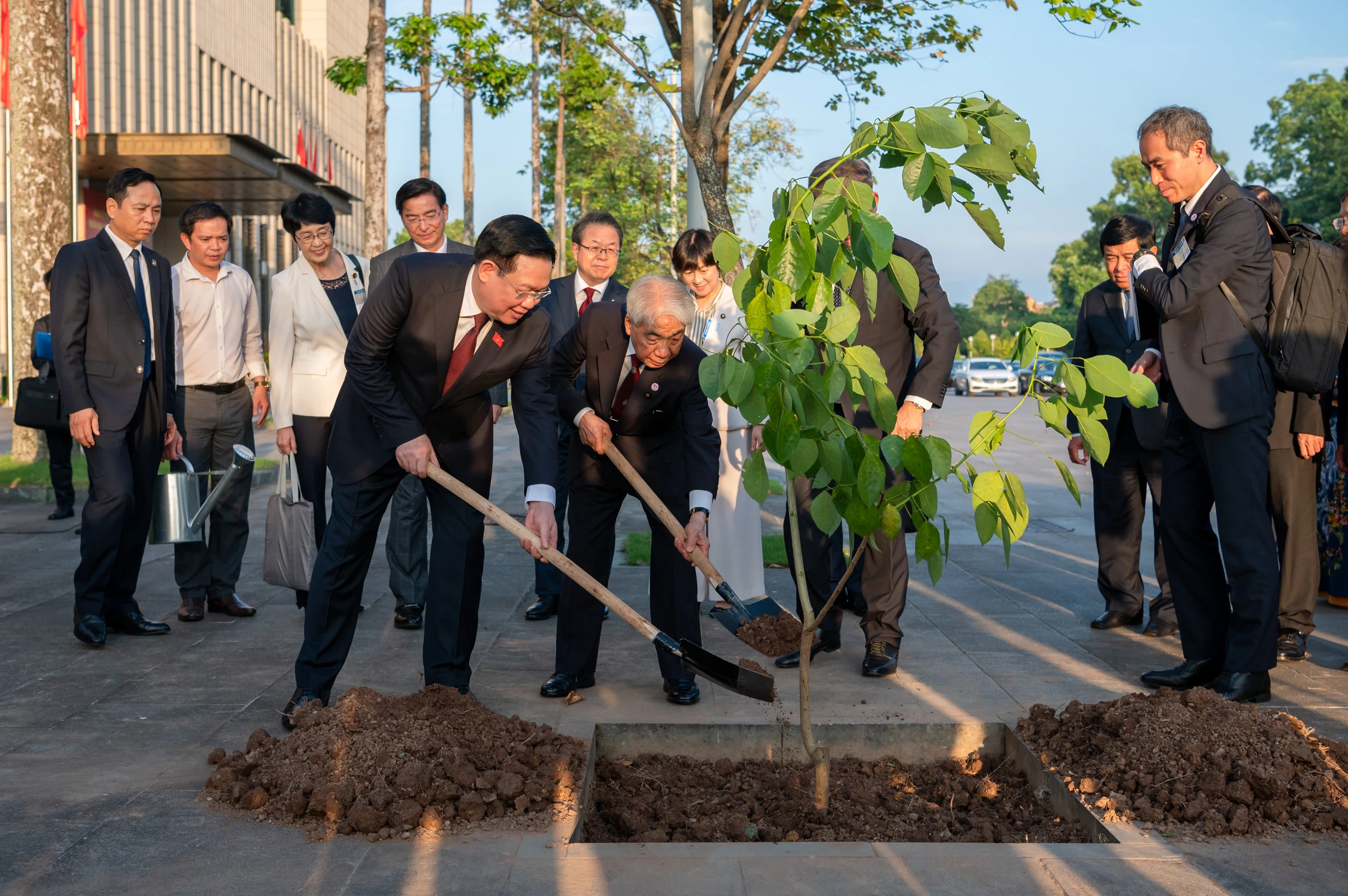 Chủ tịch Quốc hội Vương Đình Huệ cùng Chủ tịch Thượng viện Nhật Bản trồng cây lưu niệm trong khuôn viên Nhà Quốc hội. Ông Otsuji Hidehisa trực tiếp mang giống cây Osaka đỏ để trao tặng và trồng tại Việt Nam.