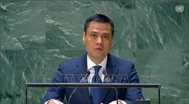 Đại sứ Đặng Hoàng Giang, Trưởng Phái đoàn Thường trực Việt Nam tại Liên hợp quốc phát biểu về lập trường của Việt Nam tại phiên họp khẩn cấp đặc biệt của Đại hội đồng. Ảnh: Thanh Tuấn/TTXVN