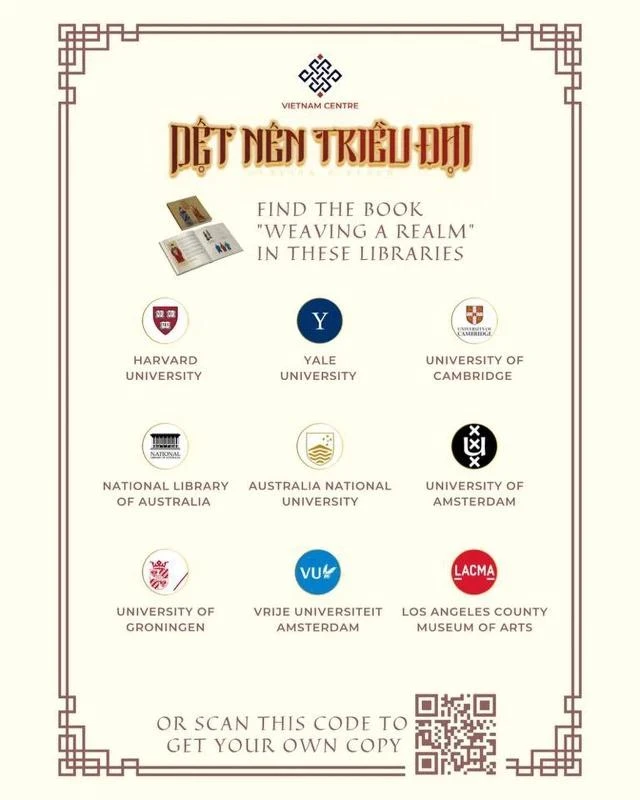 Theo thông tin mới nhất mà Vietnam Centre cập nhật, sách ảnh song ngữ về Việt phục Dệt nên triều đại (tựa tiếng Anh: Weaving a Realm, được soạn thảo bởi Vietnam Centre) đã phát hành 6.000 bản (2 lần tái bản). Đây là cuốn sách đầu tiên và là ấn phẩm song ngữ duy nhất (đến thời điểm này) về trang phục truyền thống Việt Nam. Sách đã vào Thư viện Quốc gia Úc và tất cả các thư viện thuộc ĐH Quốc gia Úc. Bên cạnh đó là các thư viện: Vrije Universiteit Amsterdam (VU Library), University of Amsterdam (UVA Library), University of Groningen (UG Library), Hà Lan; Harvard University (HOLLIS - Harvard Library), Yale University (Yale Library), Los Angeles County Museum of Art (LACMA library), Mỹ; và hệ thống Thư viện ĐH Cambridge, Vương quốc Anh và Bắc Ireland.