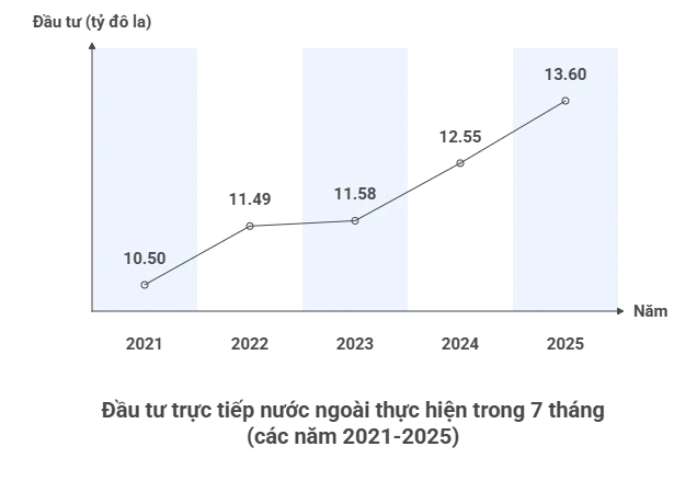 Đáng lưu ý, vốn đầu tư trực tiếp nước ngoài thực hiện tại Việt Nam bảy tháng năm 2025 ước đạt 13,6 tỷ USD, tăng 8,4% so với cùng kỳ năm trước. Đây là số vốn đầu tư trực tiếp nước ngoài thực hiện cao nhất của bảy tháng trong 5 năm qua. Trong đó: Công nghiệp chế biến, chế tạo đạt 11,1 tỷ USD, chiếm 81,6% tổng vốn đầu tư trực tiếp nước ngoài thực hiện; hoạt động kinh doanh bất động sản đạt 1,09 tỷ USD, chiếm 8,0%; sản xuất, phân phối điện, khí đốt, nước nóng, hơi nước và điều hòa không khí đạt 505,2 triệu USD, chiếm 3,7%.