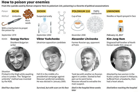 Và mới đây, vụ giết người đang xôn xao dư luận bởi nạn nhân được cho là ông Kim Jong-nam, con trai của cố chủ tịch Triều Tiên Kim Jong-il. Nếu thực sự đúng như giả thuyết người bị giết là ông Kim Jong-nam thì đây là một vụ mưu sát có rất nhiều điều kỳ lạ.