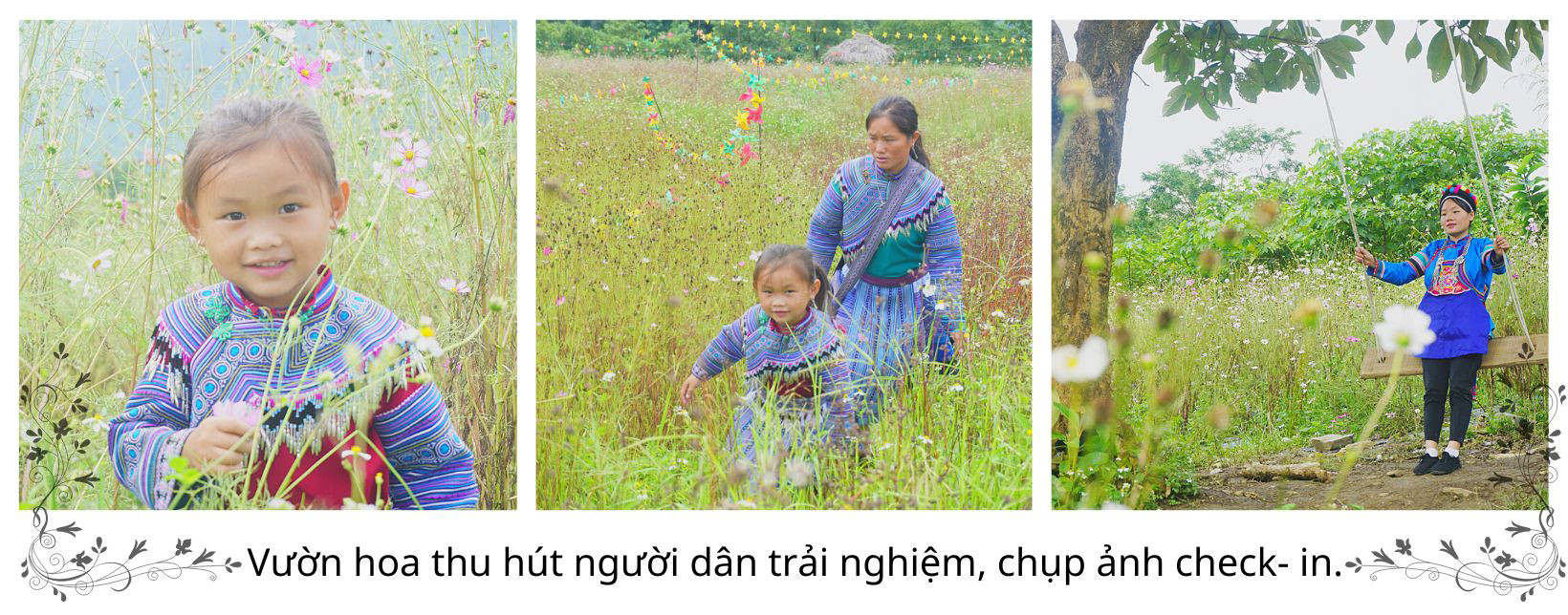 Để ngời dân có nhiều trải nghiệm thú vị, anh Củi dựng thêm một số công trình phụ trợ, như xích đu, chòi ngắm cảnh, hàng chong chóng chỉ đường…Vừa lắng nghe chia sẻ của anh Củi, chúng tôi vừa di chuyển lên phía ngọn đồi để phóng tầm mắt ngắm vườn hoa rộng mênh mông. Tại đây, một số cô gái Mông, Thu Lao, Phù Lá đang chụp ảnh để lưu lại những khoảnh khắc đẹp tại vườn hoa.