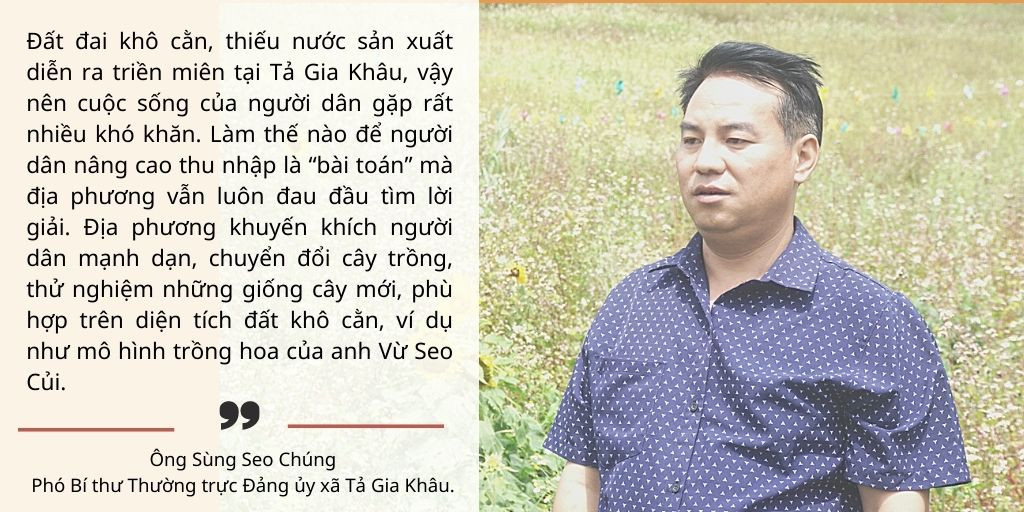 Với anh Vừ Seo Củi - chàng trai dân tộc Mông chỉ học hết lớp 6, du lịch là một khái niệm mơ hồ, kết nối quảng bá để thu hút du khách từ xa đến vườn hoa lại càng là điều anh không biết tới. Anh nghĩ đơn giản là làm một vườn hoa rộng cho người dân địa phương và các xã lân cận đến chụp ảnh. Anh tính, trên diện tích khoảng 3 ha đang trồng hoa, mọi năm trồng ngô được một vụ, những năm thời tiết quá khô cằn, hạt giống chẳng thể nảy mầm và cả năm chỉ thu được khoảng 2 tấn ngô, sau khi bán, thu được gần 14 triệu đồng - tương đương trồng hoa để phục vụ du khách trải nghiệm trong khoảng 3 tháng.
