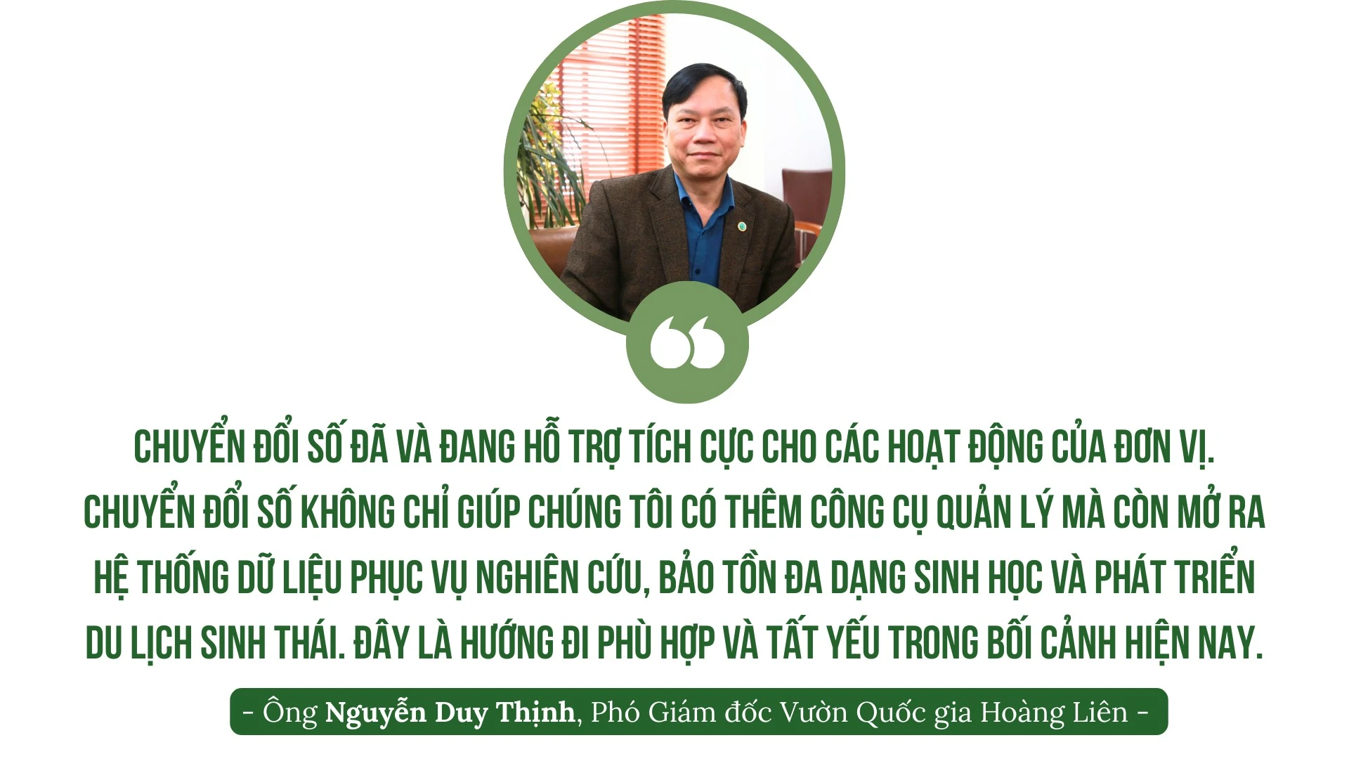Một trong những bước tiến rõ nét nhất là việc số hóa dữ liệu rừng và đất lâm nghiệp mà Vườn Quốc gia Hoàng Liên đang quản lý. Toàn bộ diện tích được cập nhật trên nền tảng bản đồ số thông qua phần mềm MapInfo, kết hợp với phần mềm theo dõi diễn biến rừng (DBR) giúp giám sát theo từng lô trạng thái. Đồng thời, dữ liệu về đa dạng sinh học, bao gồm các loài động vật, thực vật đặc hữu, quý hiếm tại khu vực cũng được tiến hành số hóa phục vụ công tác nghiên cứu, giám sát và tra cứu kịp thời, chính xác hơn.