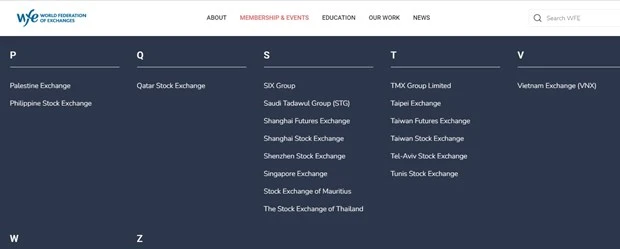 Sở Giao dịch Chứng khoán Việt Nam đã được liệt kê vào danh sách thành viên Liên đoàn các Sở Giao dịch Chứng khoán Thế giới. (Ảnh chụp màn hình)