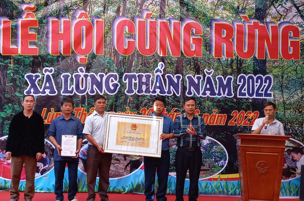 Tại buổi lễ, huyện Si Ma Cai đã trao Quyết định của UBND tỉnh về việc công nhận xếp hạng di tích thành cổ Lùng Thẩn là di tích lịch sử - văn hóa cấp tỉnh (Ảnh trên).