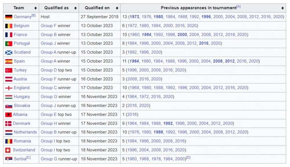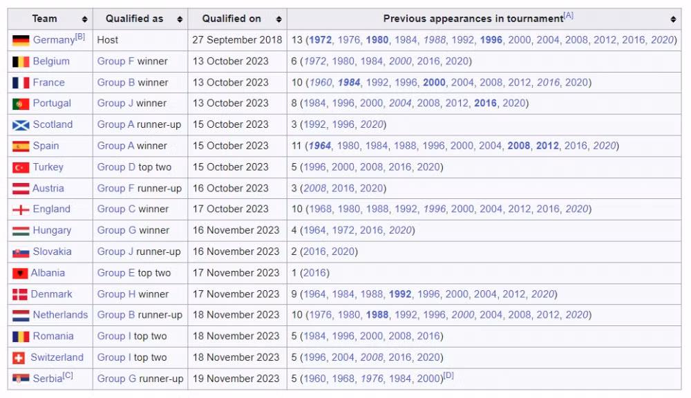 Tính đến thời điểm này, Ban tổ chức đã xác định được 17/24 đội bóng dự VCK EURO 2024 gồm: Đức (chủ nhà), Bỉ (bảng F), Pháp (bảng B), Bồ Đào Nha (bảng J), Tây Ban Nha (bảng A), Scotland (bảng A), Thổ Nhĩ Kỳ (bảng D), Áo (bảng F), Anh (bảng C), Hungary (G), Slovakia (J), Albania (E), Đan Mạch (H), Hà Lan (B), Romania (I), Thụy Sĩ (I) và Serbia (G).