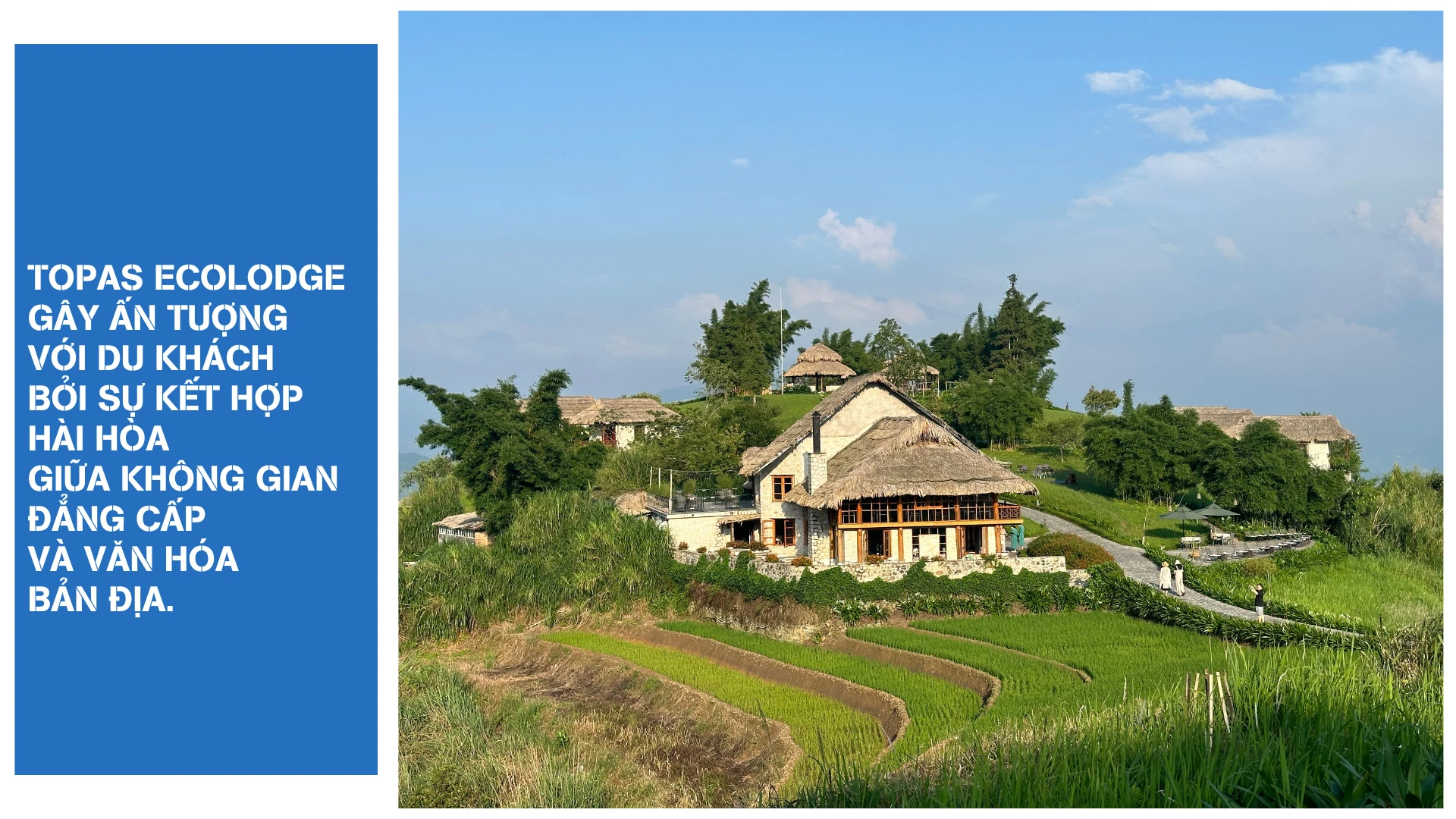 Tại đây có 50 căn villa được dựng theo lối kiến trúc nhà sàn truyền thống của người Tày, mỗi căn có sức chứa tối đa 3 người lớn và 2 trẻ em, đáp ứng nhu cầu nghỉ dưỡng của các gia đình. Một điểm đặc biệt nữa là khu nghỉ dưỡng còn cho người dân mượn lại đất trống để canh tác nông nghiệp, vừa tạo sinh kế bền vững, vừa góp phần đưa thiên nhiên hòa quyện vào từng căn villa.