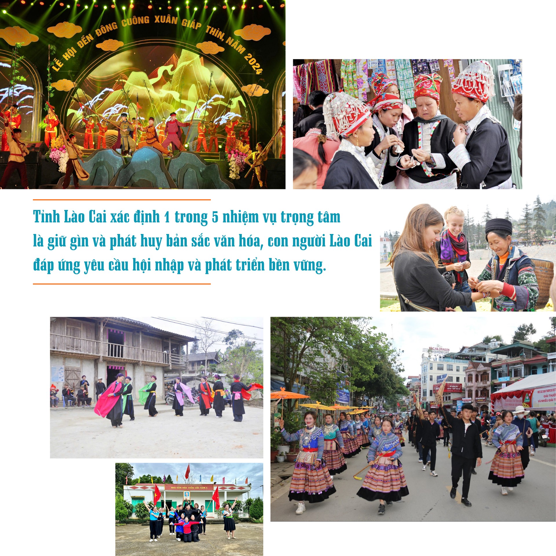 Tỉnh cũng xác định 1 trong 5 nhiệm vụ trọng tâm là giữ gìn và phát huy bản sắc văn hóa, con người Lào Cai đáp ứng yêu cầu hội nhập và phát triển bền vững, khơi dậy mạnh mẽ tinh thần yêu nước, tự chủ, tự tin, tự lực, tự cường, tự hào dân tộc, khát vọng vươn lên. Nâng cao dân trí, chăm lo xây dựng và phát triển văn hóa, con người Lào Cai với các đặc tính cơ bản của con người Việt Nam, mang đặc trưng của miền đất biên cương của Tổ quốc “Đoàn kết - Yêu nước - Kỷ cương - Văn minh - Hiếu khách”.
