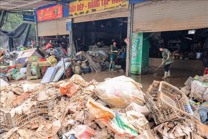 Những "núi" hàng hóa thành phế phẩm sau cơn lũ dữ. Ảnh: Hoàng Hiếu/TTXVN