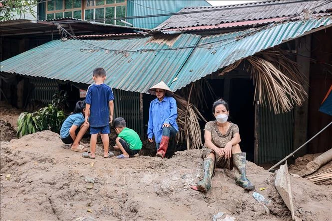 Người dân mệt mỏi sau nhiều giờ dọn dẹp đống bùn đất cùng nhà cửa bị hư hỏng. Ảnh: Hoàng Hiếu/TTXVN