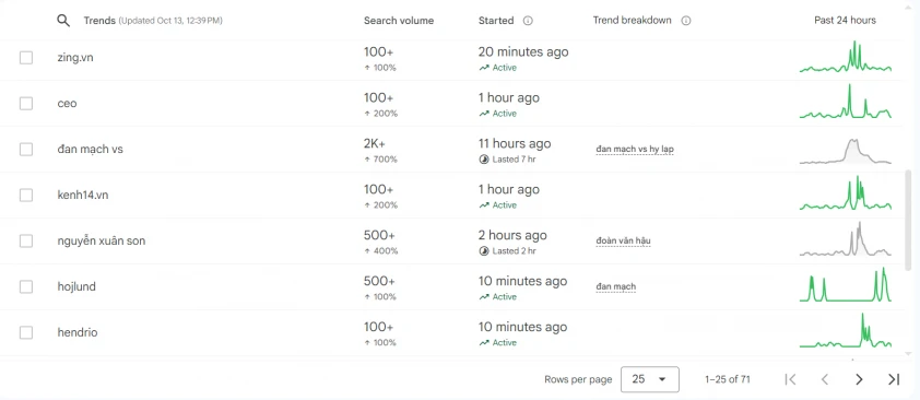 Đáng chú ý trong buổi sáng 13/10, cái tên Nguyễn Xuân Sơn tiếp tục gây sốt khi lọt top xu hướng tìm kiếm nổi bật nhất tại Việt Nam, theo dữ liệu từ Google Trends. Cầu thủ này ghi nhận mức tăng tới 400% lượng tìm kiếm tính đến trưa cùng ngày, vượt qua hàng loạt chủ đề hot trong nước.