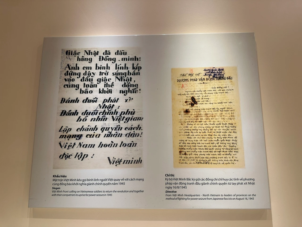 Theo bà Phạm Thị Mai Thủy, những bộ sưu tập truyền đơn, báo chí trong cao trào Cách mạng tháng Tám năm 1945; nhóm văn bản, tài liệu phổ biến đường lối của Đảng, Mặt trận Việt Minh được xem là điểm nhấn của đợt trưng bày lần này. Trong đó, đáng chú ý nhất có: Nghị quyết Hội nghị lần thứ VIII Trung ương Đảng Cộng sản Đông Dương; Tuyên ngôn của Mặt trận Việt Minh năm 1941; Chỉ thị của Tổng bộ Việt Minh; Mệnh lệnh khởi nghĩa của Ủy ban chỉ huy lâm thời khu giải phóng ngày 12/8/1945 do đồng chí Võ Nguyên Giáp ký.