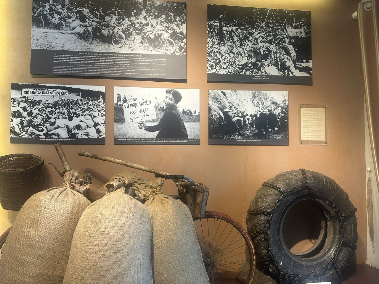 Đoàn xe đạp thồ chở lương thực, vũ khí phục vụ chiến trường trong Đông Xuân 1953 - 1954 (ảnh trêncùng, bên trái)