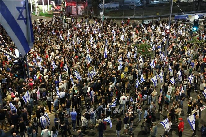 Người dân tham gia biểu tình kêu gọi ngừng bắn ở Gaza và giải cứu con tin, tại Tel Aviv, Israel, ngày 6/4/2024. Ảnh: AFP/TTXVN