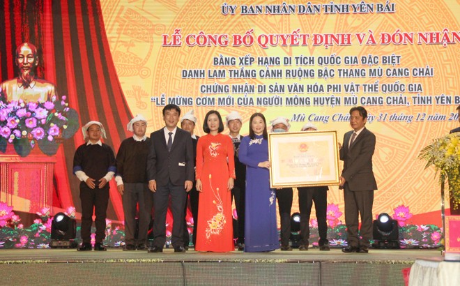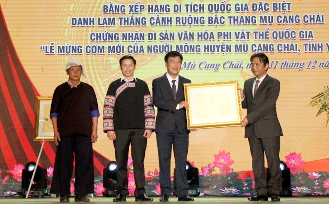 Yên Bái đón nhận Bằng xếp hạng Di tích Quốc gia đặc biệt danh lam thắng cảnh Ruộng bậc thang Mù Cang Chải và chứng nhận “Lễ mừng cơm mới của người Mông huyện Mù Cang Chải” là Di sản văn hóa phi vật thể cấp quốc gia