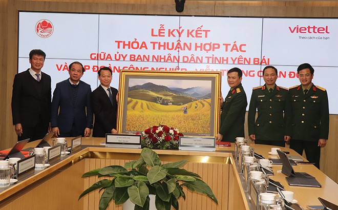 Lãnh đạo tỉnh Yên Bái tặng lưu niệm lãnh đạo Tập đoàn Viettel bức tranh Danh thắng Quốc gia Ruộng bậc thang Mù Cang Chải.